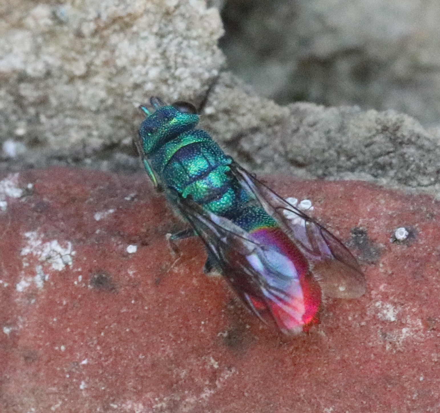 questa è una femmina di Chrysisfulgida L. Il suo comportamento è insolito, ma penso che sia solo molto assetata e pertanto alla ricerca di qualche fonte di cibo e liquidi.