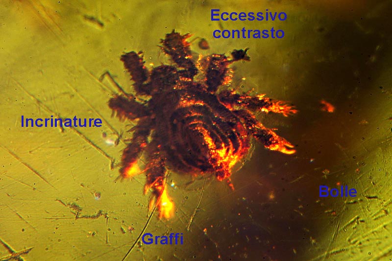 L’illuminazione si è mal distribuita, secondo le linee preferenziali dell’ambra, creando zone molto illuminate e “bruciate”, a confronto con altre rimaste buie. Sono evidentissime le decine di incrinature e di graffi che il tempo ha solcato sulla tenera resina (capirai, con 20 milioni di anni, c’è n’è stato di tempo a sufficienza per rigarla). E poi bollicine d’aria, le sporcherie varie che inquinavano l’aria di allora, ecc. ecc.