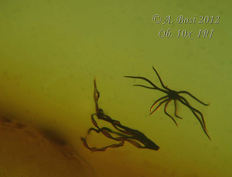 Un esempio tipico può essere questa immagine, in cui vi sono dei microscopici peli vegetali e apici di muschio che normalmente viaggiano nell’aria trasportati dal vento. Al contatto con la resina fresca, sono rimasti intrappolati e perfettamente conservati fino ad oggi. A causa della loro forma piuttosto aggrovigliata, sono comunemente chiamati stellate hairs e sono tipici delle ambre provenienti dal mar Baltico.