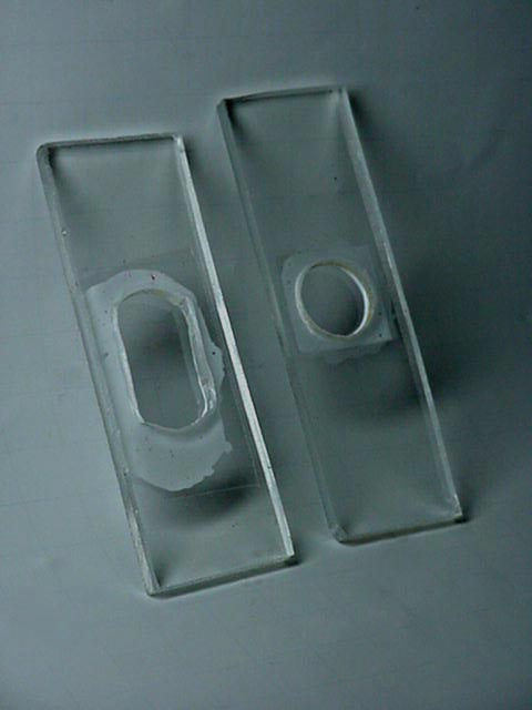 Sono dei vetrini porta oggetto auto costruiti, partendo da una lastrina di plexiglas spessa 6mm, dove al centro è ricavato un foro di varie forme e dimensioni. Il foro viene poi chiuso con un sottile copri oggetto che garantirà così la massima trasparenza (la visione nel microscopio invertito avviene da sotto).