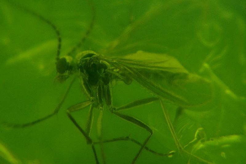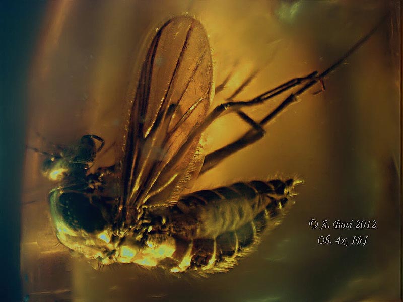 Oltre tutto, l’illuminazione incidente dava talvolta origine ad un particolare effetto che in microscopia si chiama “Illuminazione Obliqua o IO”, una tecnica che accentua moltissimo tutti i minimi rilievi, le più piccole increspature. Come si vede dalla foto, la tecnica IO va benissimo se lo scopo è mettere in evidenza il delicato disegno e la trama delle ali, ma rende esagerate le pieghe della resina, formate a suo tempo dai movimenti scomposti della zanzara nei suoi disperati tentativi di liberarsi dalla morsa della resina.