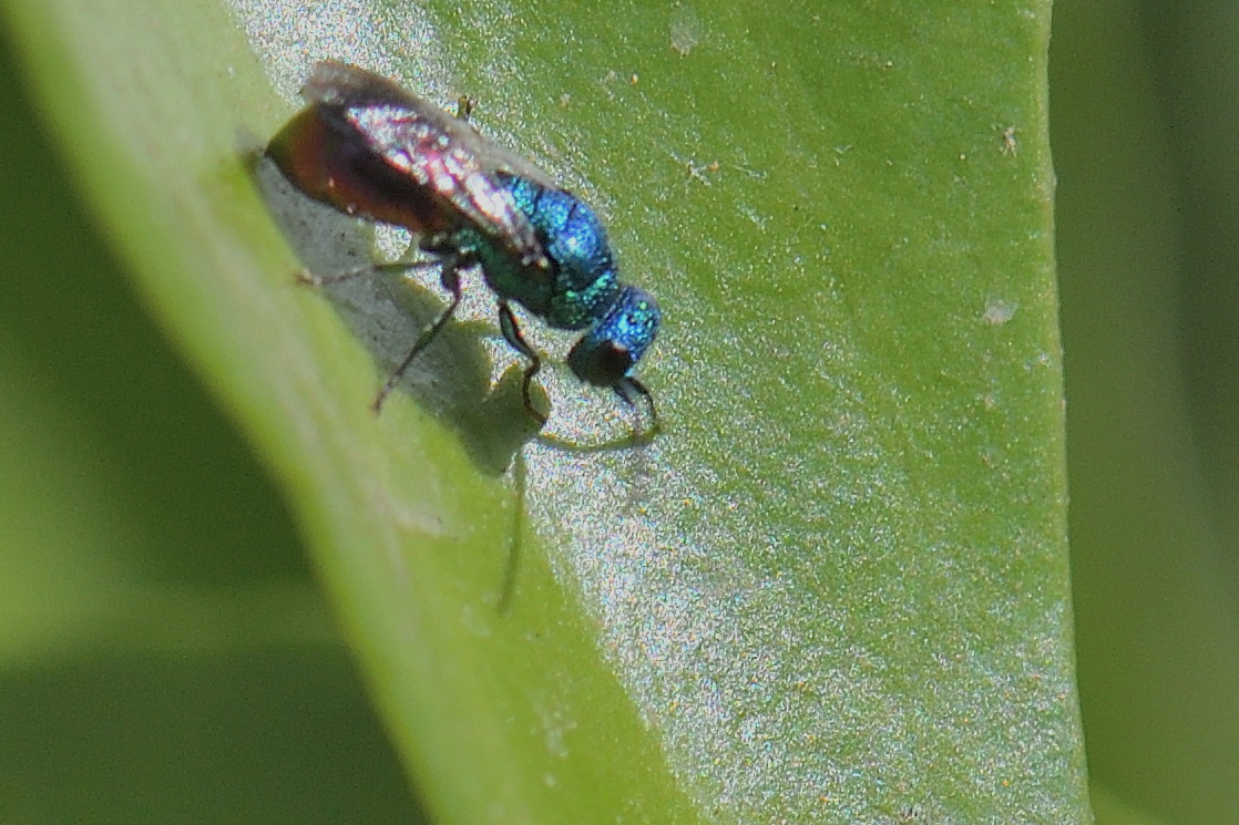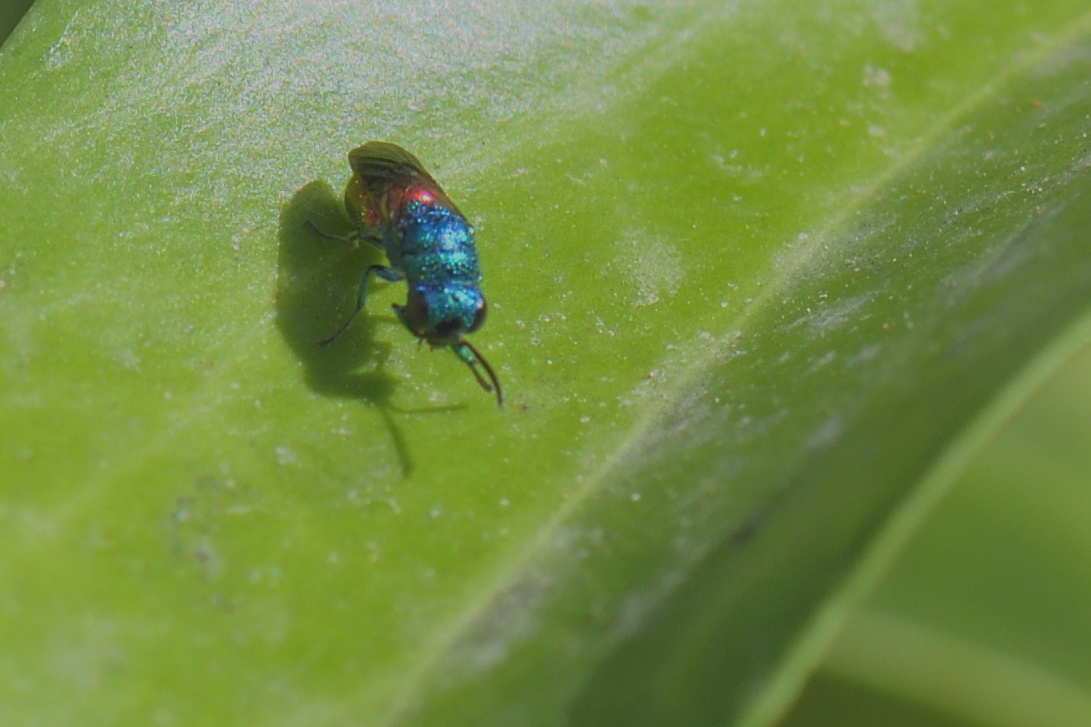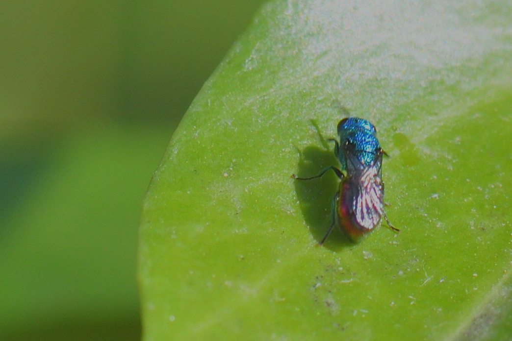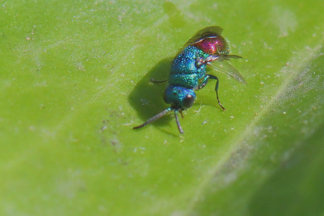 This small wasp appeared in my garden (Sollies toucas - Var - France) on an Ivy leaf for a few seconds, I found it small (maybe 5 mm) and the ID proposed on iNaturalist (by Villu) is Chrysellampus sculpticollis.