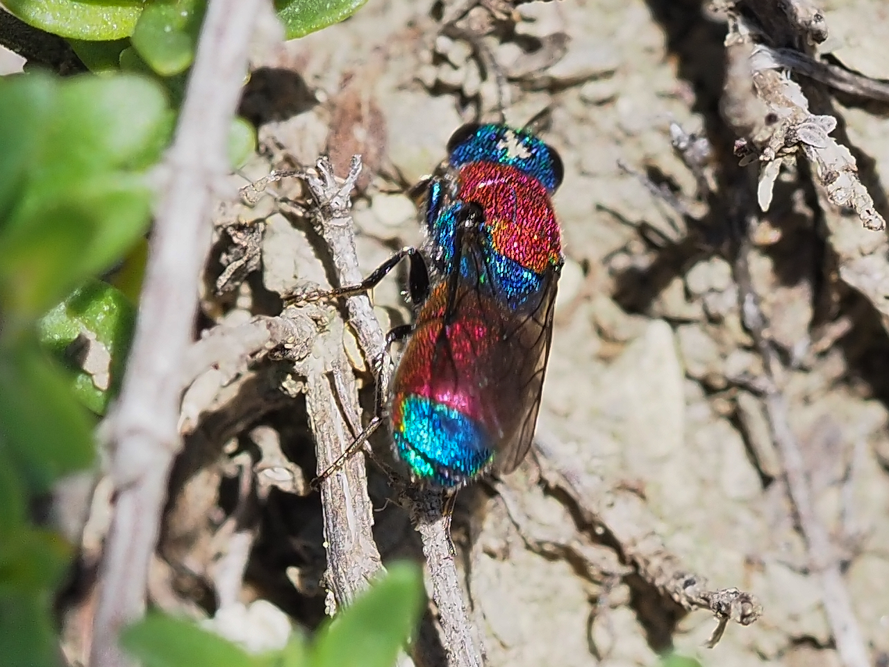 28 May 2022. I hesitate to post this because the photos are horrible - usual story, when you really want a clear image, they will not stop running. But I wonder if the colour pattern, with blue T3 and a small anterolateral red/yellow patch on each side, is enough to confirm Chrysis chrysostigma?