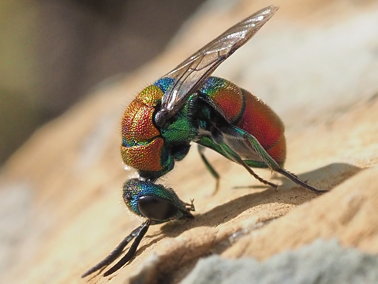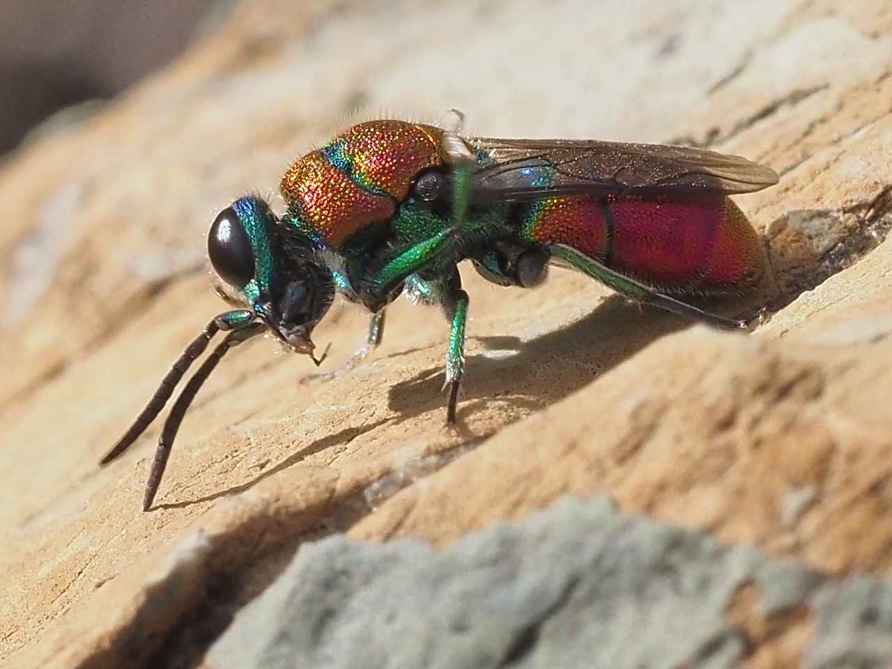 10 June 2023. N Apennines. In the past couple of years I have found this species at three different sites in the upper Val d’Arda (I’m indebted to Paolo Rosa for giving me the initial ID on this forum). A few days ago I visited a particularly good site for chrysidids when the sun came out in the late afternoon after a day of heavy cloud and rain. There was a lot of chrysidid activity - it seemed that they had just emerged from shelter. Among them was this Chrysis coeruleiventris which, happily, stood still for several seconds while cleaning itself and (apparently) stretching. I am posting some images from this period. The usual red colour on the thorax appears tinged with orange because of the low sun which was unfortunately lighting the far side of the wasp.