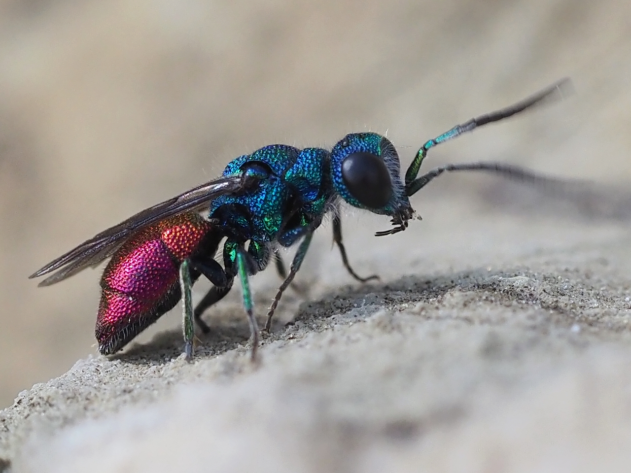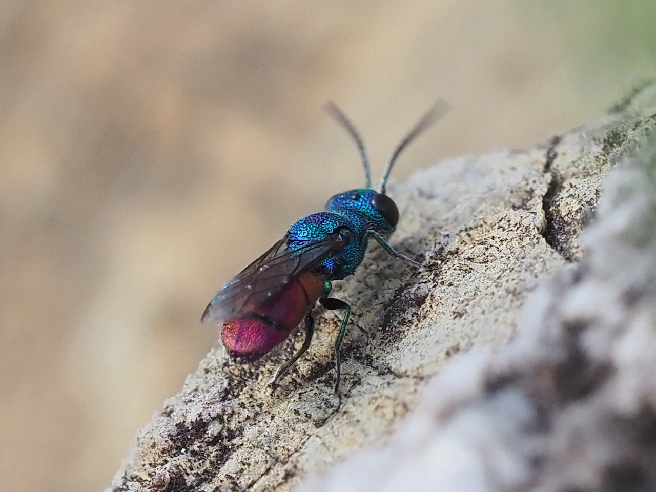 28 May 2023. Rocky trackside bank, Val d’Arda, N. Apennines, Italy. Another basically blue and red chrysidid, but seemed to have a proportionally small abdomen but large head: or is that just my imagination? Or is it a puny male? Any advice on identification, if possible from these photos, would be much appreciated!