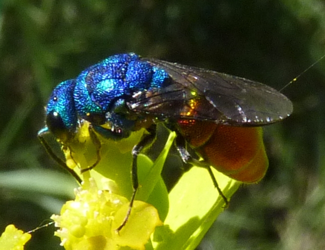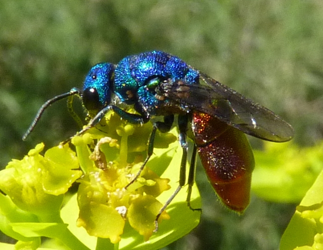 Thanks a lot Paolo! Yes it was fairly large In the very same plant of Euphorbia I've found other two Chrysididae! But without photos One was a bit smaller and th the last abdominal terguite blue, abdomen red and head and thorax blue. But I took only a frontal photo where the abdomen cannot be seen and it flew away And the other was spectacular! Much smaller (maybe 6-7 mm) and totally blue-green, similar to Trichrysis cyanea. But the wind was shaking the plant and I cannot take a decent image of it, only blurry ones before it flew away