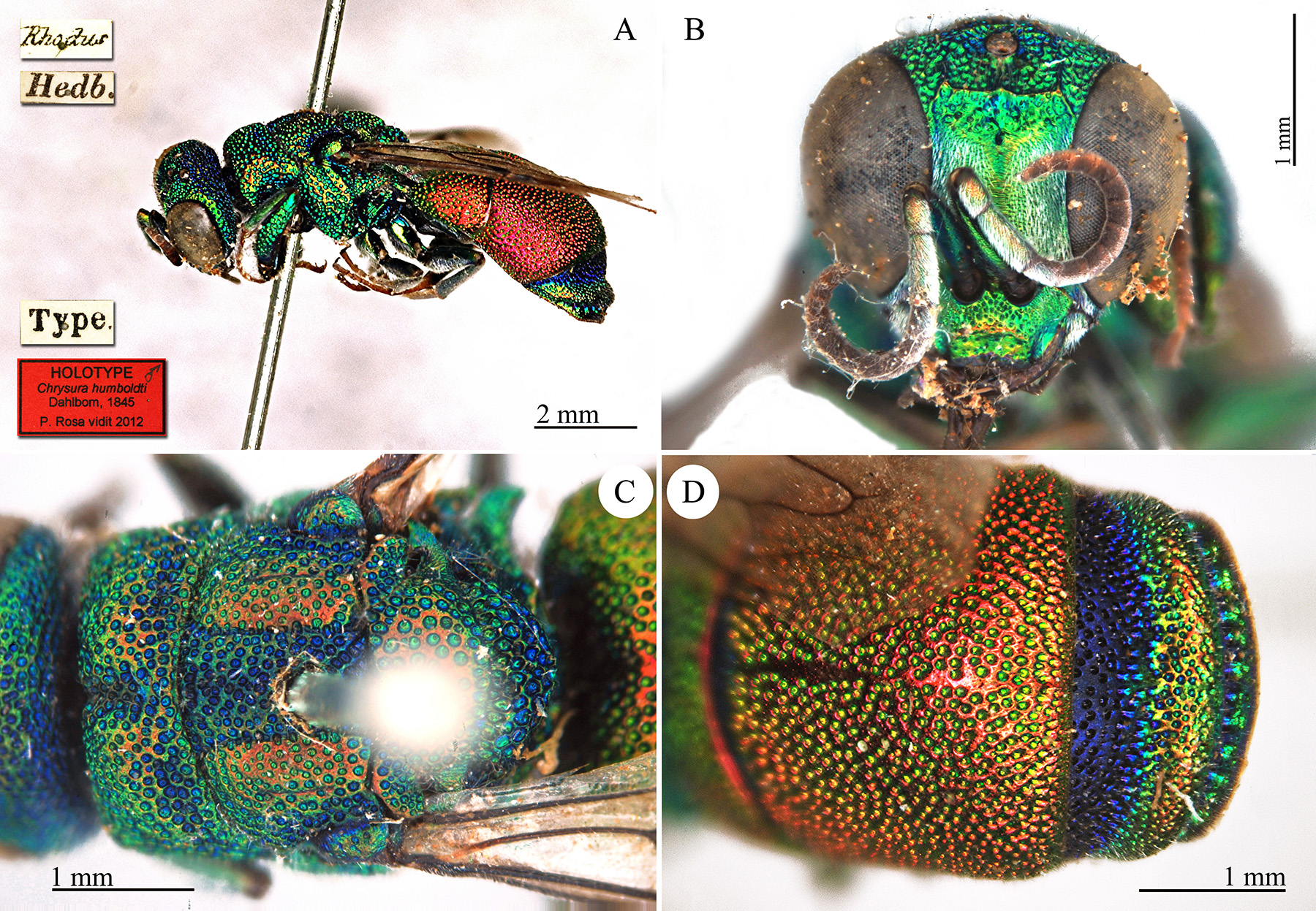 I recently found a couple of Pseudochrysis humboldti at Ribiers (Hautes-Alpes, France) and I noticed that the female have a ponctuation thinner and denser than the male, she's also more coppery on thorax.