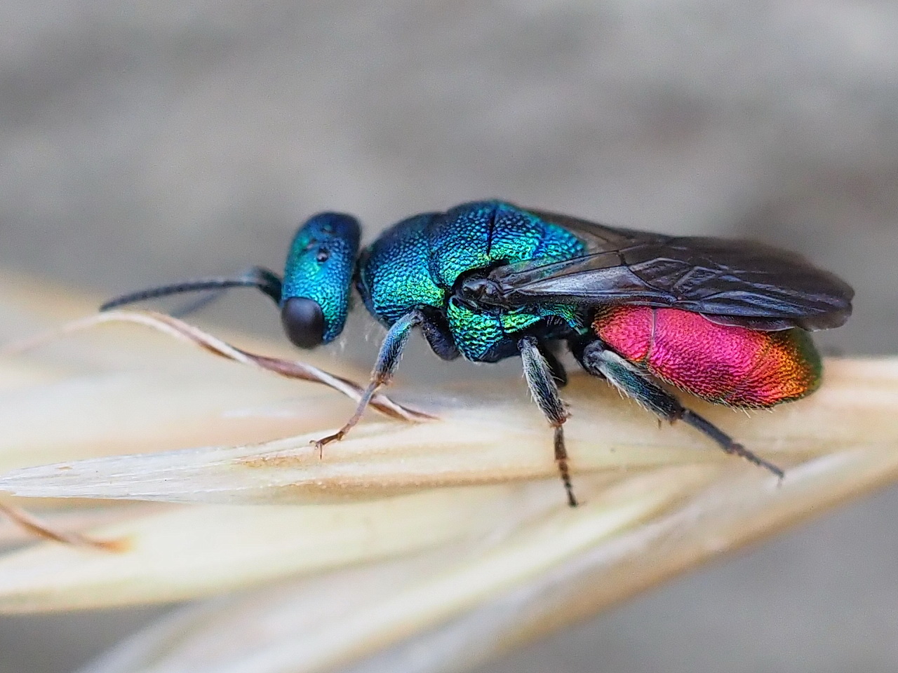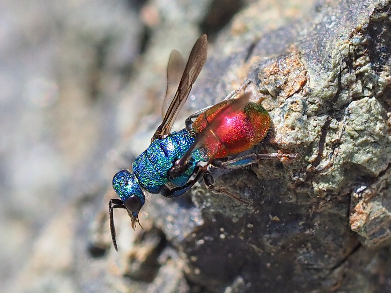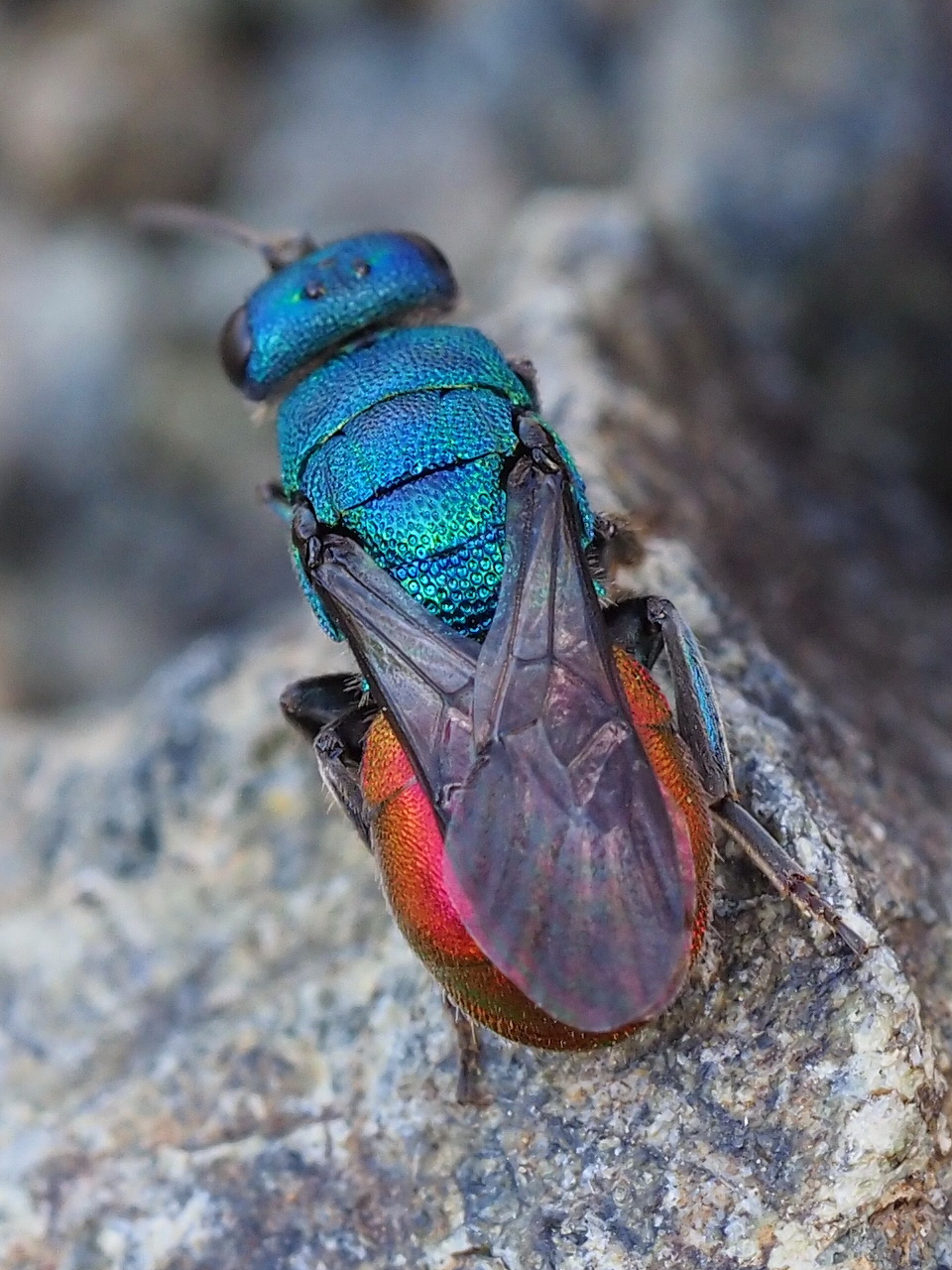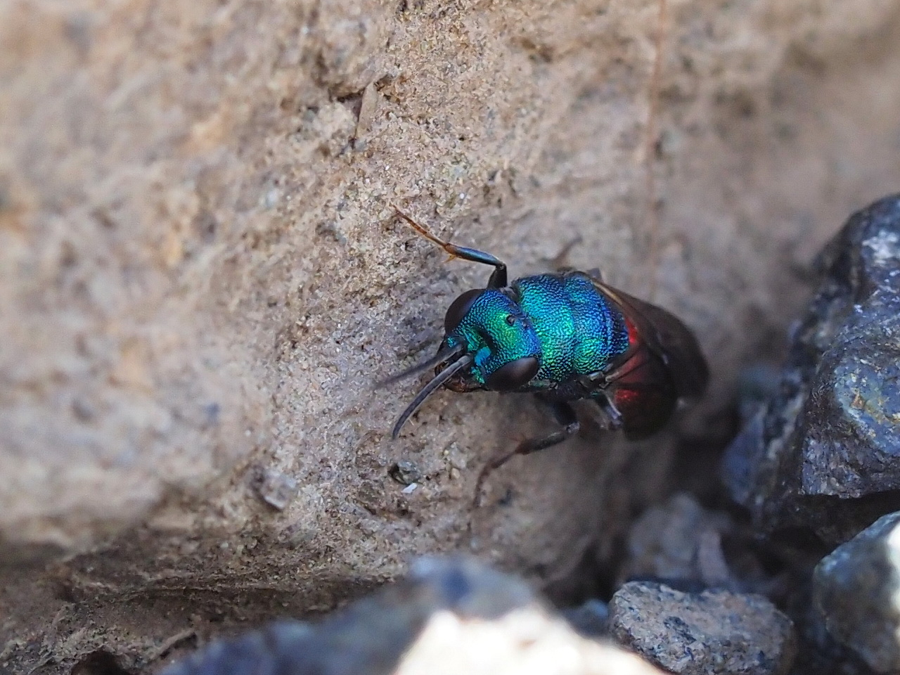 Just two more chrysidids from recent stay in Appenines hills of Prov. Piacenza. This one early July, emerged from crevice under rock on stony slope of ophiolitic mountain, c 1,100m. It spent several minutes grooming and standing still in sun before flying and walking about within a few metres, often returning to original stone. Looked green and deep slightly purplish red with naked eye. Investigating apparent holes under stones and rocks. It seemed unconcerned by my presence, unlike the Parnopes grandior that I was trying to photograph, which would touch down from flight for 1-2 seconds at most!