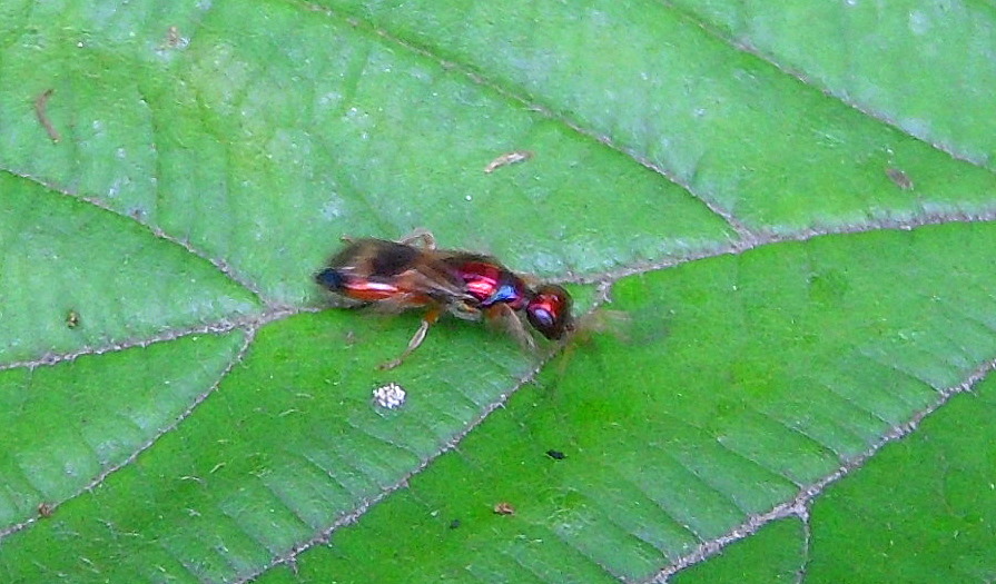 - coxae, trochanters, femora and tibiae dark brown or brownish black, excepting yellowish brown fore tibiae, especially on lower face. Outer side of fore femora with a coppery highlight or golden tint. Scape dark brown with reddish coppery tint at upper side. Pedicel, flagellomeres brown, except pale brown Ped apically, and F-I-(II). Head, including face, usually pronotum, mesonotum extensively flame red, or often partly green; scutellum, postscutellum golden red or golden green. Propodeum, excepting the black oblique grooves, mesopleuron, extensively bluish green or greenish blue, and golden along ventral margin and in front. Mesopleuron finely striate, at most rugose partly. T-IV dark brown, without or rarely with pale blue reflection or tint ....... C. semiauratus (L.)