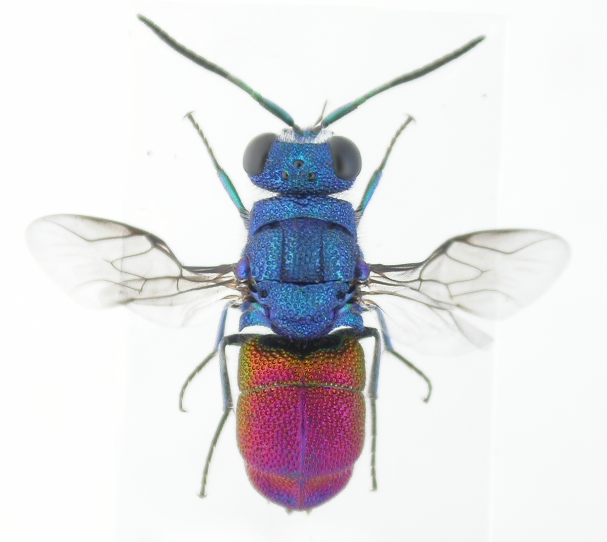 Con questo esemplare vado più sul sicuro: Chrysis mysticalis. Misura 7.1 mm. Raccolto anch'esso su melata di afidi su tamerice. Dati di raccolta: Saline di Cagliari, 21.VII.2015, R. Rattu leg.: