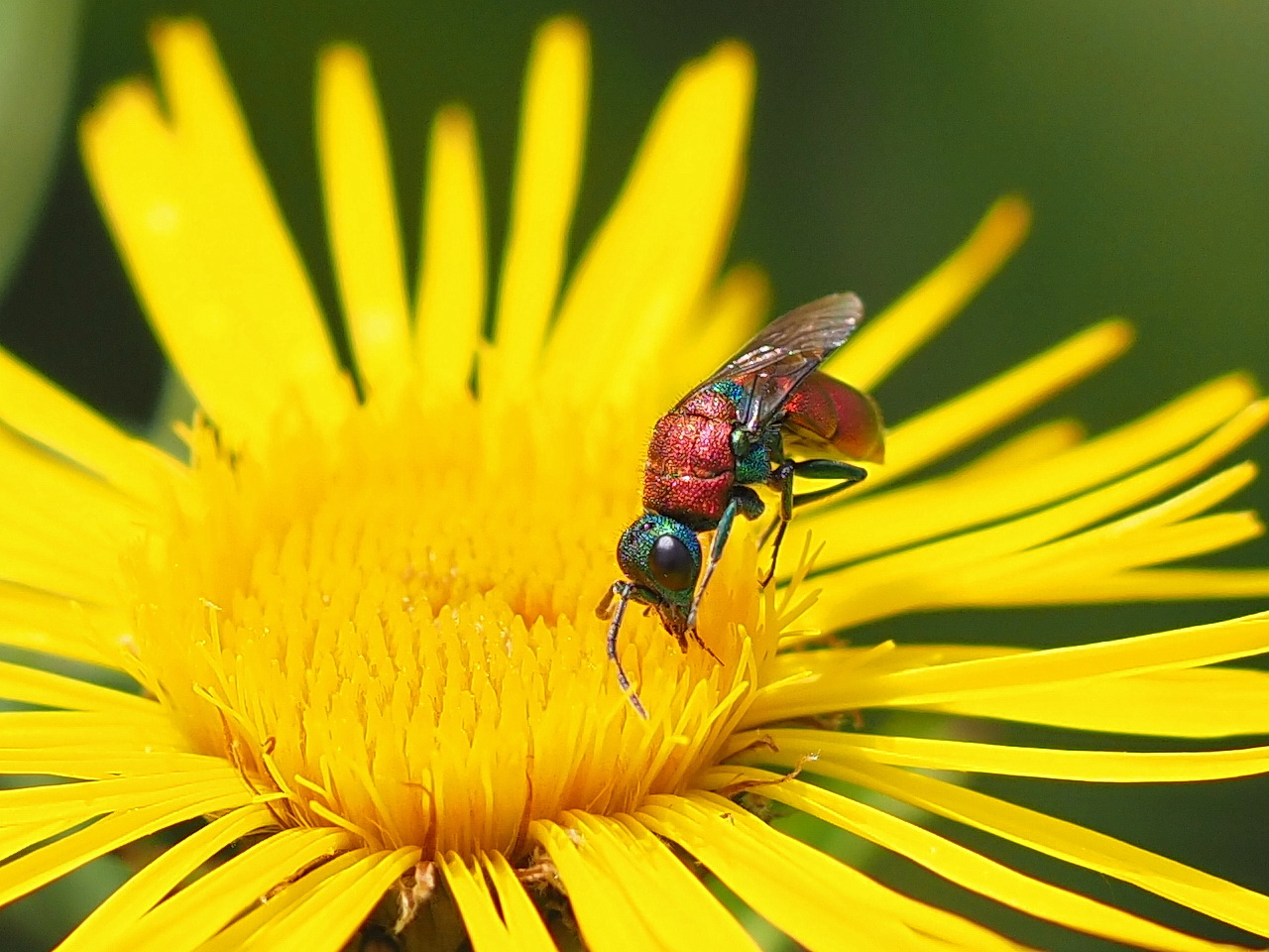About 10.30, small damp meadow area in woods, Apennine foothills, Val d’Arda, N Italy. I was trying to photograph bees when this suddenly appeared next to me. It had its mouthparts in the flower for about 2 seconds then flew away. Looks quite like images of Chrysura dichroa, but I’d really like to know the correct genus (and species if possible...). Thanks for any help. Second image blurred as it flew but shows overall shape.