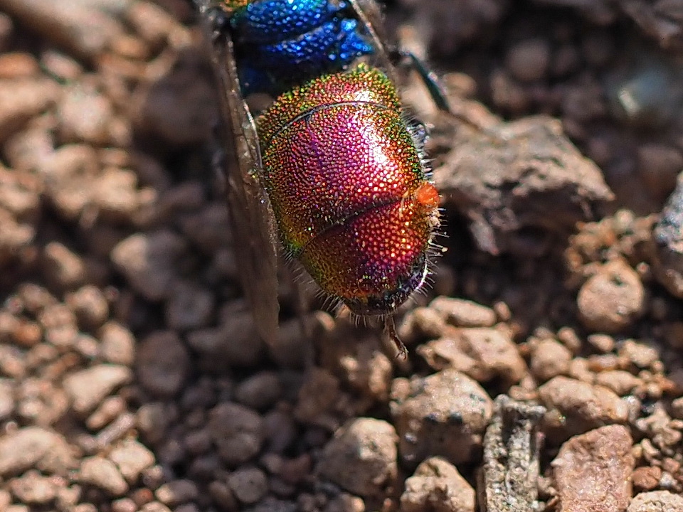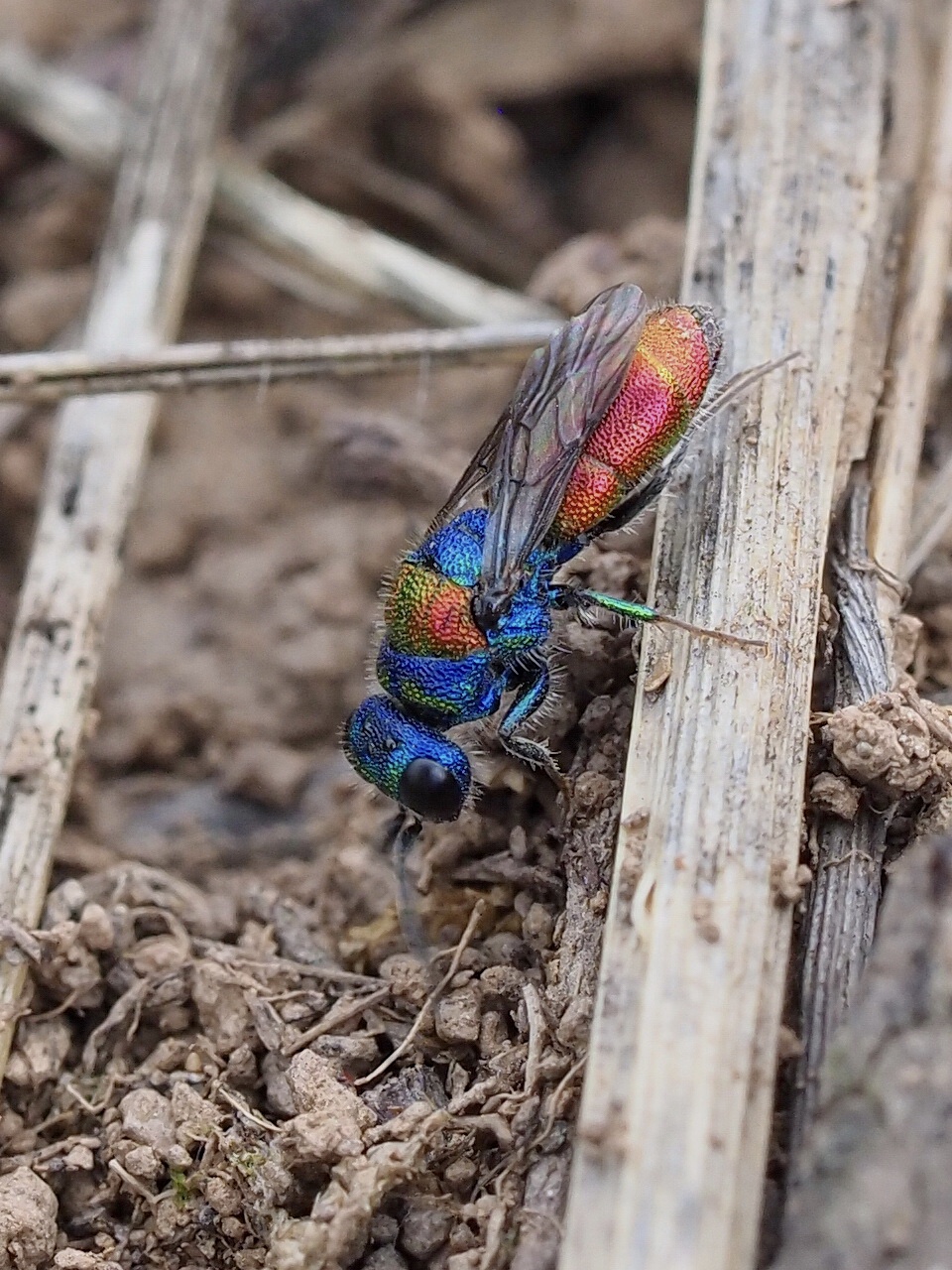 Found in a small area of compacted sandy soil with coarse grass and other low vegetation. About 950 m. It was running around on the ground, occasionally among plants, sometimes scratching into the sand. Then it would suddenly fly a few centimetres, then again, then a metre or more, then I would lose it. Halictid bees and crabronid wasps (Tachysphex, small Crossocerus) nest where the chrysidids were seen (the same site where Hedychridium krajnaki and another similar to He. roseum were found, see recent posts).