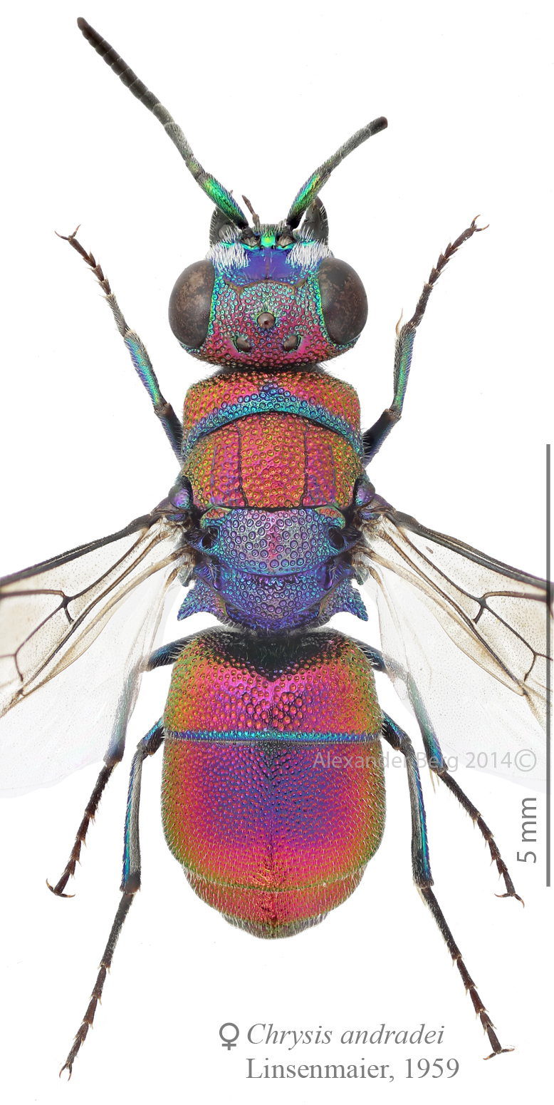 Another set of specimens, the first one should be correctly ID'd, Chrysis andradei, Linsenmaier 1959, while the Philoctetes I'm much more unsure about. I get it to P. micans, Klug 1835 in Linsenmaier 1959, if I start keying in the Philoctetes key, but I'm not sure if thats the correct subgenus since his interpretation of the taxon is different to the "modern" one following Kimsey & Bohart 1991.
