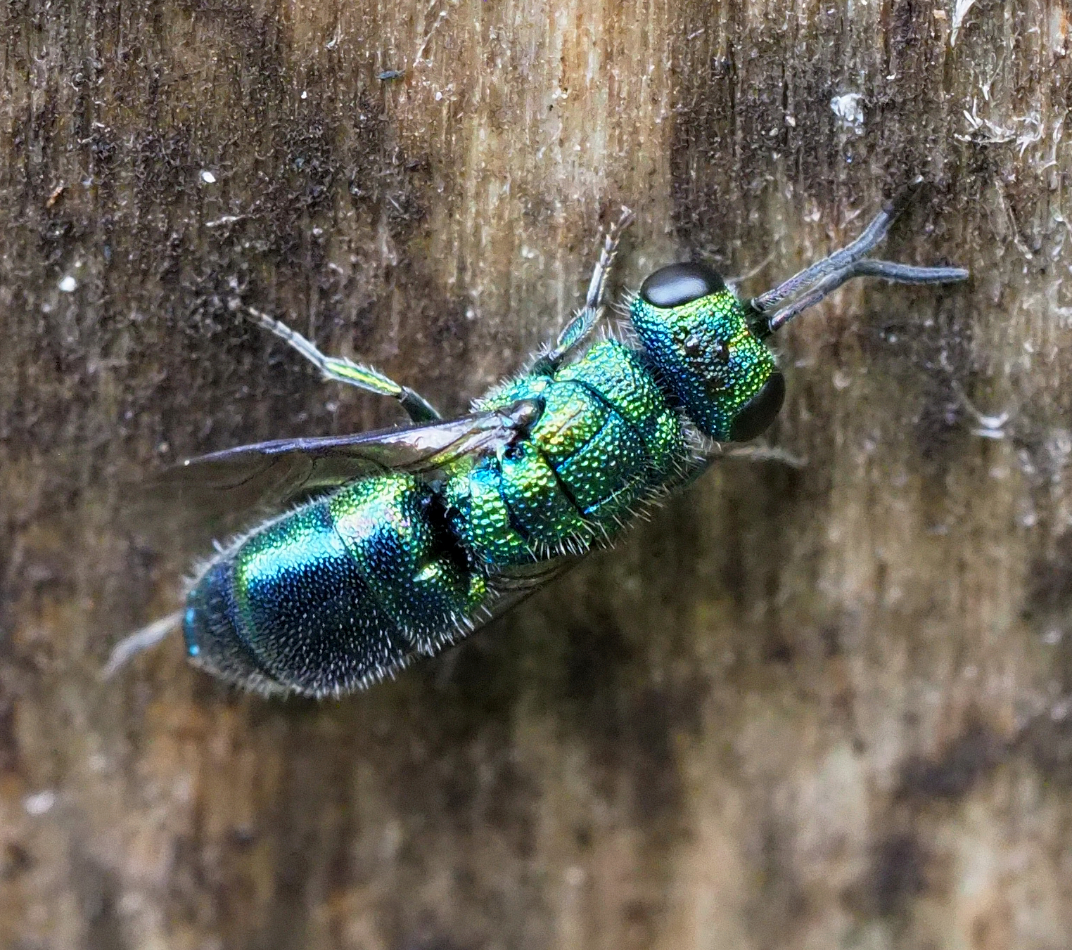 Middle of the day, 11 September, Val d'Arda (PC), Emilia-Romagna, North Italy. I was waiting next to an old pile of cut logs in a corner of a meadow, hoping to see Ectemnius, Tachysphex, and other wasps that live there. At several moments one or more usually two chrysidids would appear on the logs. Both were blue-green in general colour, the larger one (6-7mm) with more blue in the abdomen, the smaller one (5-6mm and slender) mostly green. They rushed around at high speed, running and flying, and only once stopped for a moment, when I was able to take photographs. I think the photos are of the larger one. Is there a chance of telling me the genus? Perhaps species? OK, I know species will be very unlikely. I wondered if it might be a Chrysidea? I think there is a small point on each side at rear of thorax. But that is wishful thinking because it would be a new genus for me! Thanks for any help.