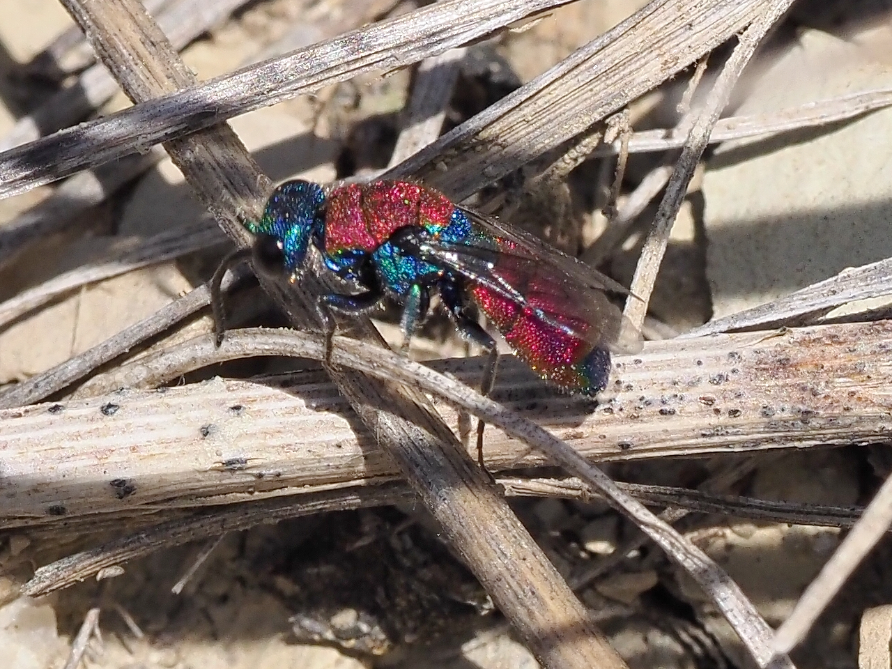 28 May 2022. I hesitate to post this because the photos are horrible - usual story, when you really want a clear image, they will not stop running. But I wonder if the colour pattern, with blue T3 and a small anterolateral red/yellow patch on each side, is enough to confirm Chrysis chrysostigma?