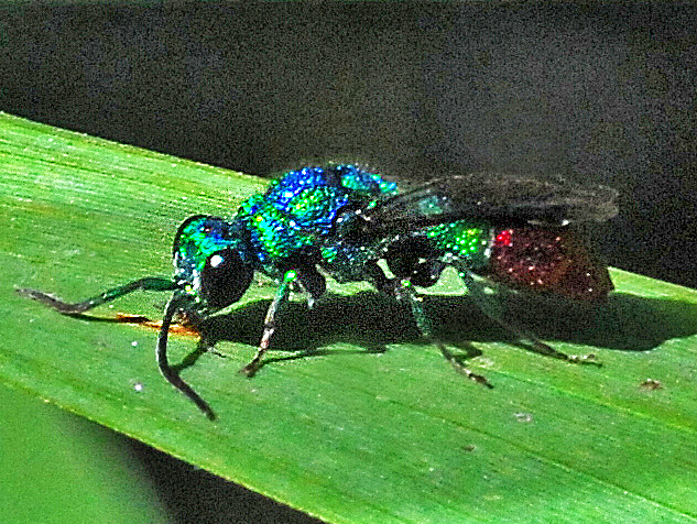 Tra le foglie di piccole canne a bordo della strada (stesso posto di qualche anno fa) erano presenti numerose vespe e varie specie di icneumonidi, nonché il criside qui di seguito rappresentato (ca. 1 cm di lunghezza). Ispezionava accuratamente tutte le foglie, cibandosi occasionalmente di qualche secrezione non identificata (forse di afidi, presenti qua e là).